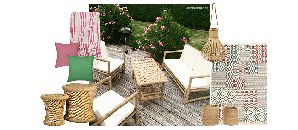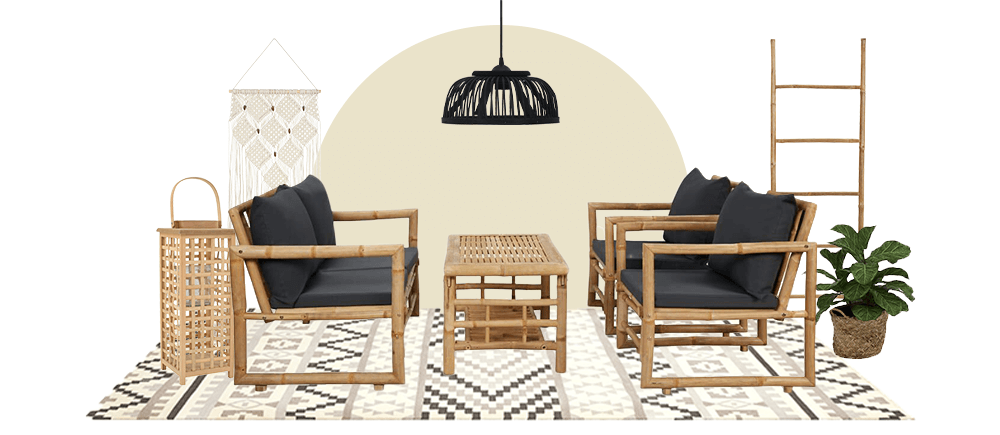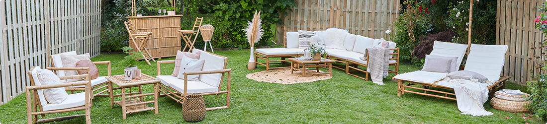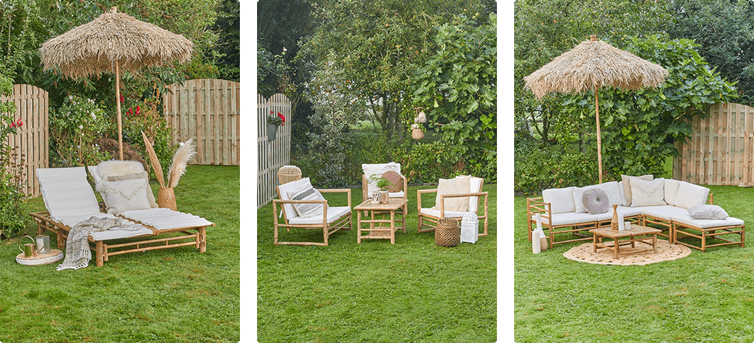 Boost your garden's zen vibe with bamboo accents. Combine bamboo rugs and lanterns to bring a natural feel. Add a bamboo sun umbrella to your patio for an exotic look. Complete the tropical look with a bamboo garden bed and trellis. Use bamboo fencing to create a cosy nook. Finish off with throws and pillows in happy colours for a bohemian flair.